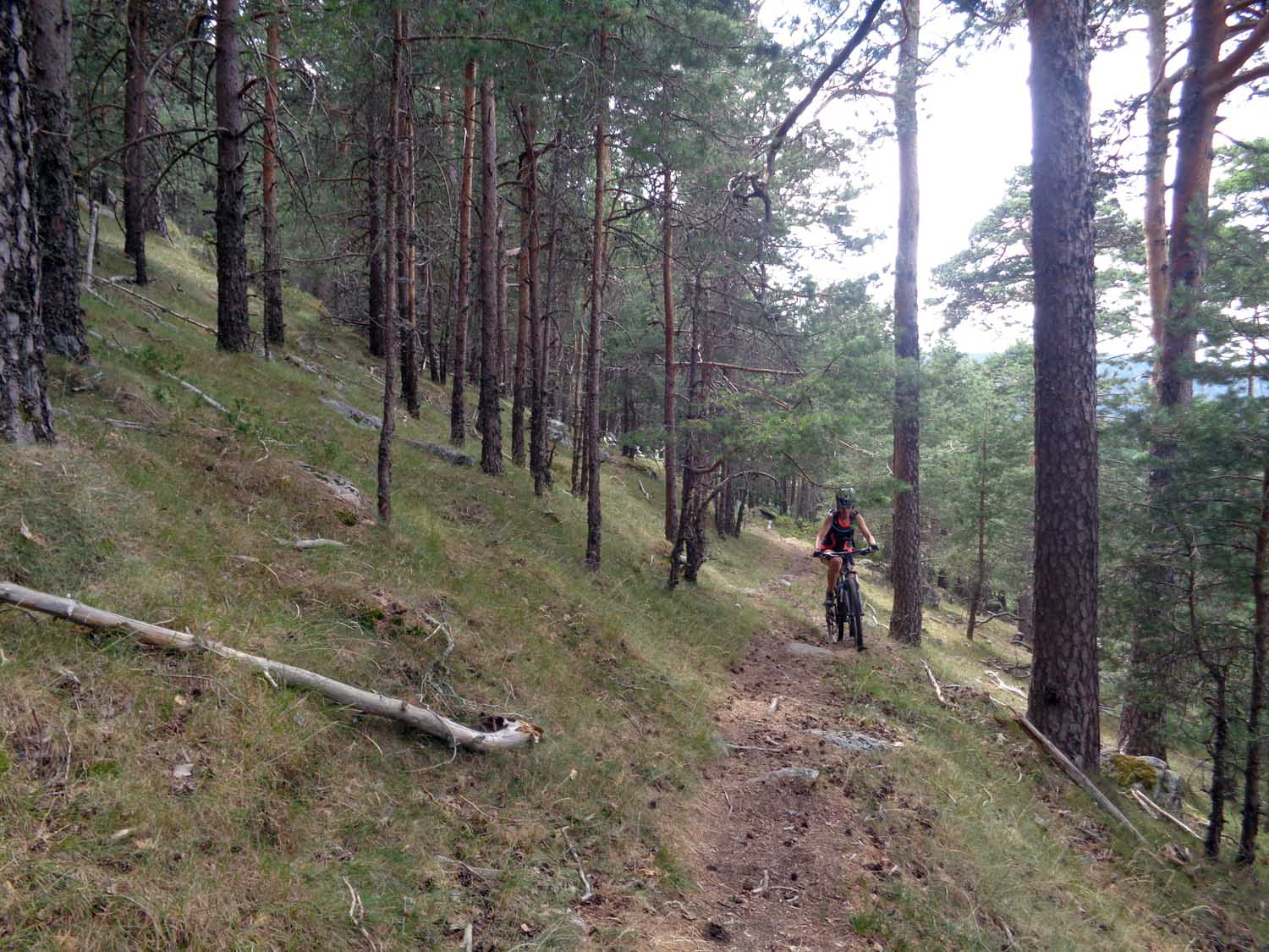 Km. 40,2 - Cortafuegos de La Berruga. El cortafuegos desciende muy trialero por la ladera de La Berruga, con tramos empinados y de piedra suelta, aunque hay una trazada sendero que permite bajar montado en la bici. Atraviesa varias veces la pista y casi al llegar a la Nacional 6 lo dejamos cogiendo la pista que cogimos desde el Cerro de la Viña al comenzar la ruta.