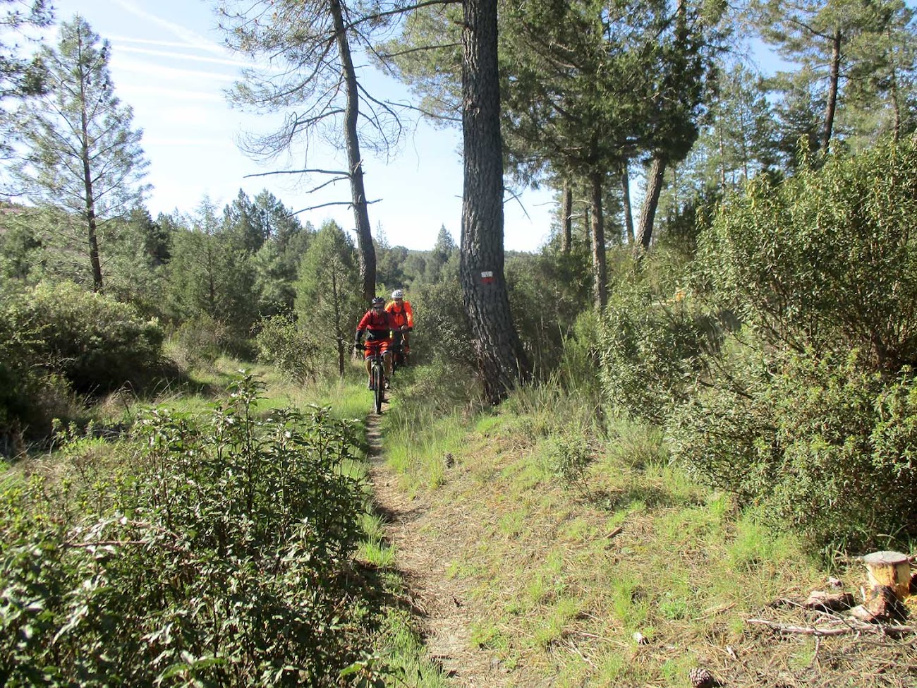 Km. 3,2 - Senda Arroyo de la Virgen. Dejamos la carretera bajando dirección Oeste por un sendero trialero y empinado, que forma parte del GR-60, el tramo Tamajón-Campillejo. El sendero baja hasta el Arroyo de Valdelapuerta, enlaza con el Arroyo de la Virgen y continua encajonado entre suaves lomas de sustrato pizarroso, acompañando al arroyo y cruzandolo en múltiples ocasiones. Si estamos en época de lluvias puede ir muy crecido y ser complicado pasar alguno de los vados. Al rato el sendero gira hacia el Norte y abandona el Arroyo de la Virgen, subiendo encajonado en un barranco, algo trialero y con una pendiente media del 6 %, atravesando un bonito pinar hasta alcanzar la encrucijada de la Piedra Blanca, nombre que recibe la bifurcación de la carretera a Majaelrayo con la GU-188, que va a la Presa de El Vado.